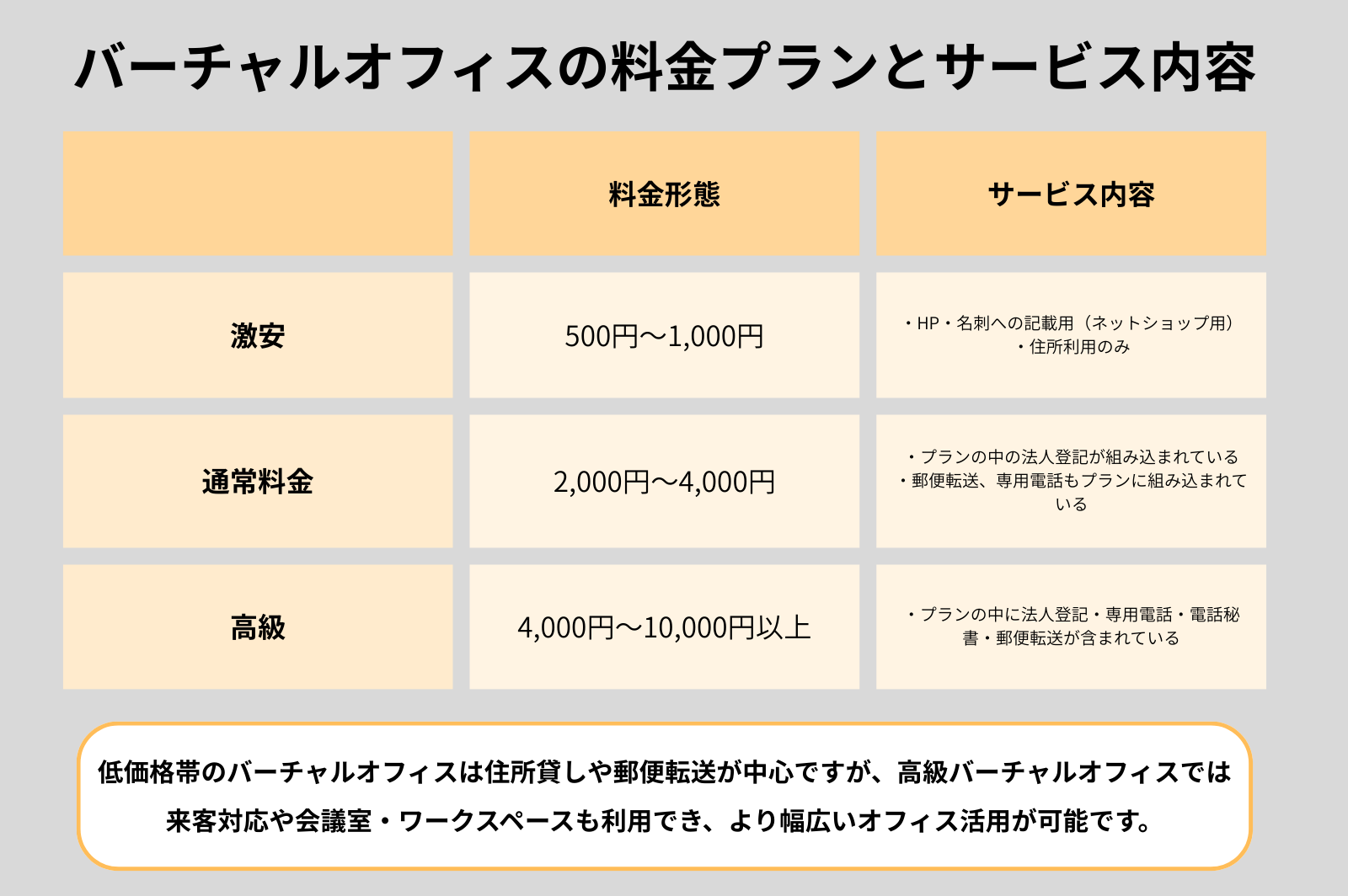 バーチャルオフィスの料金プランとサービス内容