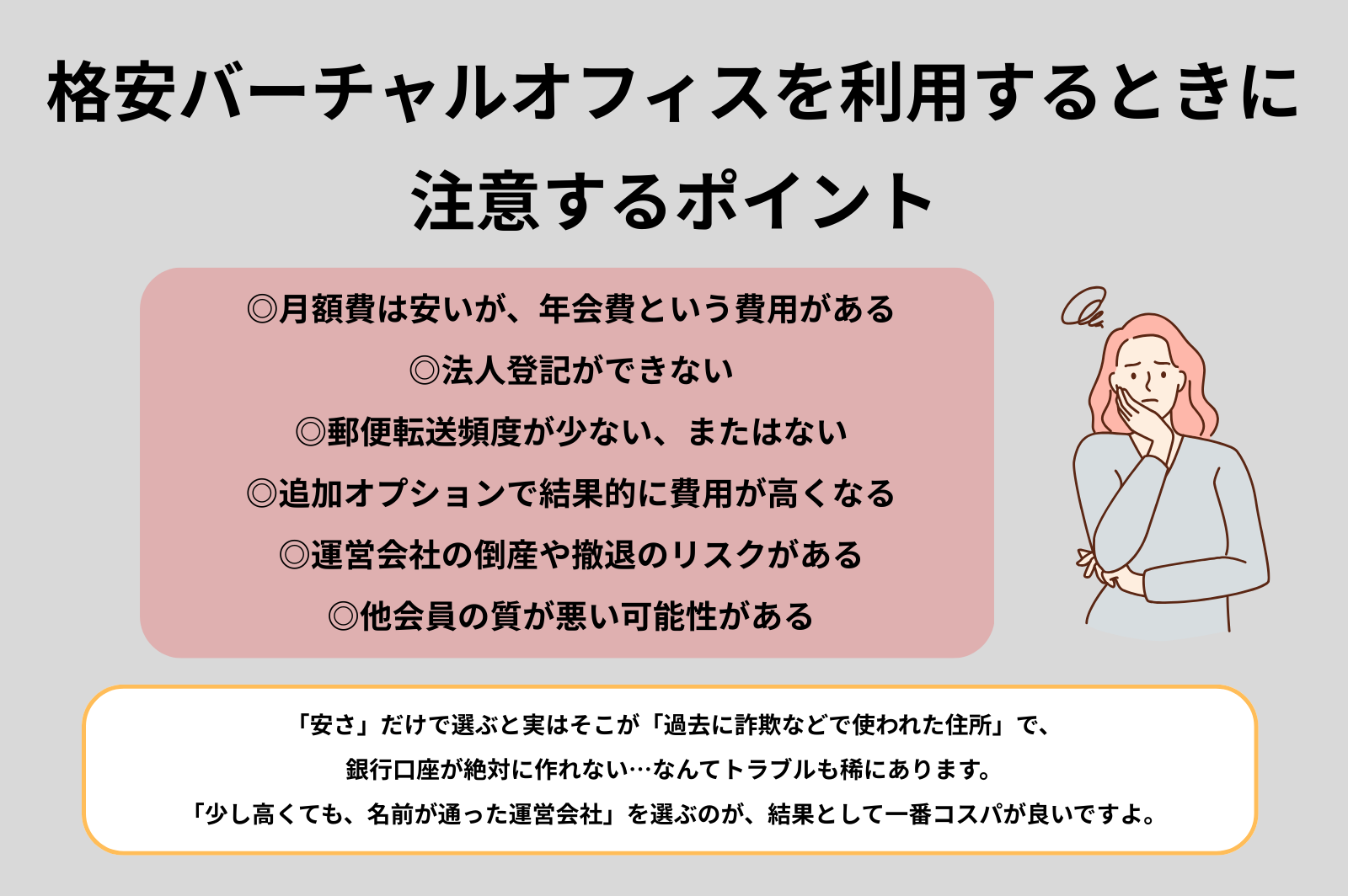 もし一つでも不安に感じたり、困るなと思うのであれば、少しグレードの高いプランにするか、通常価格帯のバーチャルオフィスで契約するようにしましょう。