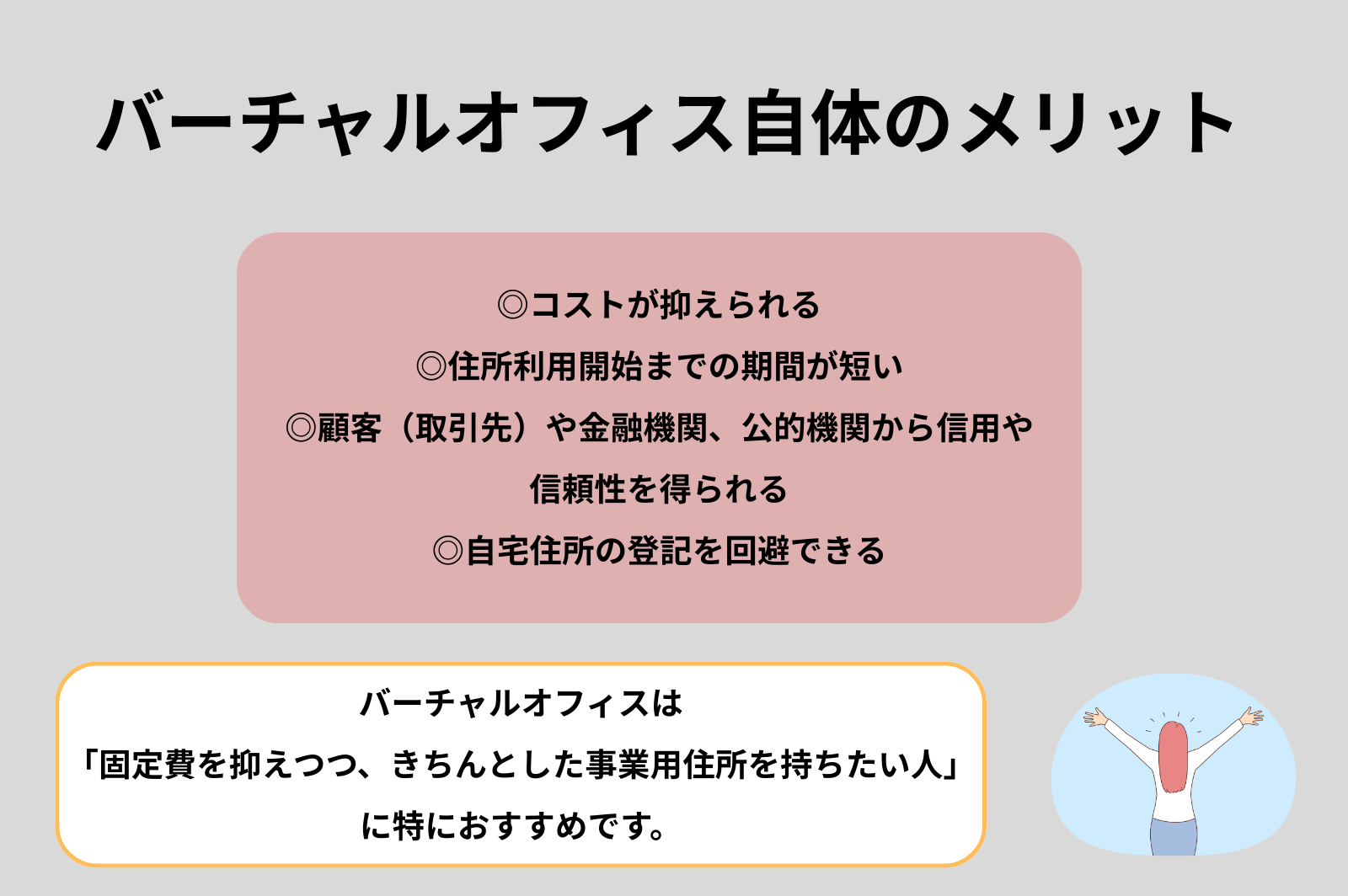 次はバーチャルオフィスのメリットについて説明します。