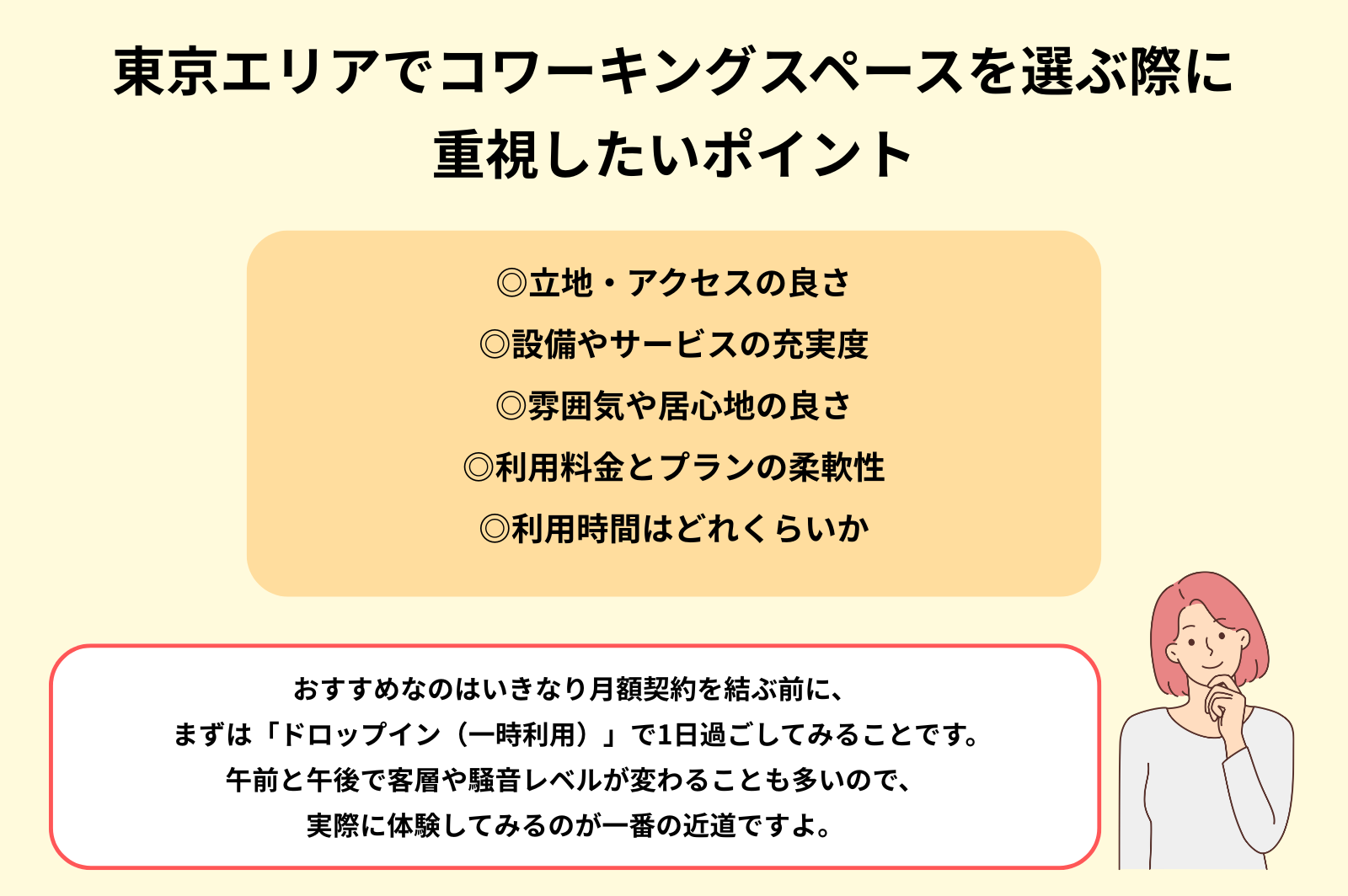 東京エリアでコワーキングスペースを選ぶ際に重視したいポイントについて、それぞれ詳しく解説します。